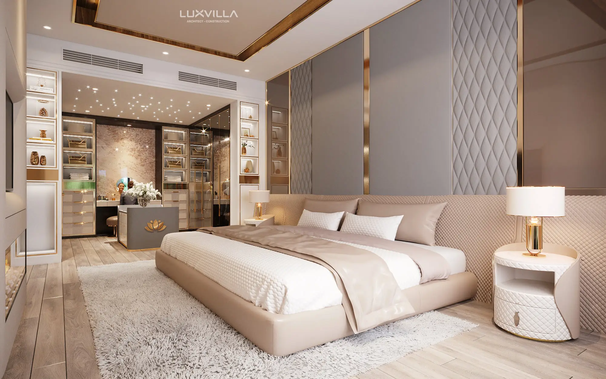 CHỊ HÀ VILLA – Công trình chị Hà Villa được Luxvilla thiết kế và thi công hoàn thiện hạng mục nội thất. Công trình được hoàn thành cuối năm 2021 với tổng diện tích sàn khoảng 800m2. Căn biệt thự bao gồm các không gian chức năng như: 1 khách bếp, 4 phòng ngủ, 1 phòng sinh hoạt chung, 1 hầm rượu và không gian tập gym. Các phòng ngủ đều được thiết kế hiện đại, tiện nghi với các không gian chức năng phụ trợ như không gian bàn trà, không gian thay đồ và vệ sinh khép kín.