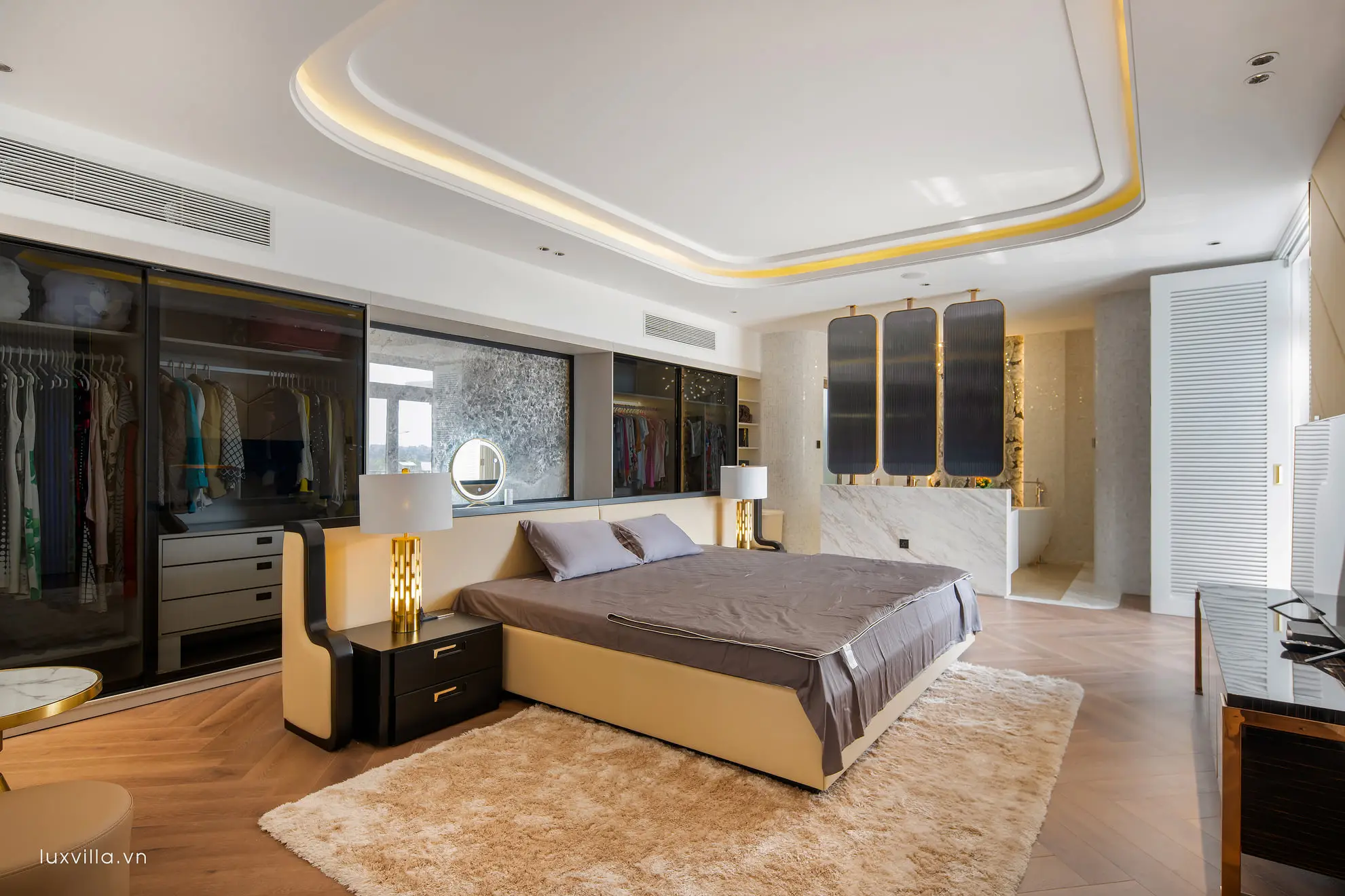 Đây là căn biệt thự với phong cách hiện đại được Luxvilla thiết kế kết hợp giữa gỗ công nghiệp và gỗ tự nhiên nhằm tạo nên sự sang trọng nhưng vẫn không kém phần ấm cúng cho không gian nội thất. Những hạng mục nội thất rời như sofa, kệ tivi, bàn ghế ăn được nhập khẩu từ các thương hiệu nội thất cao cấp đến từ Italia.Sự phối hợp hài hòa này không chỉ mang lại vẻ đẹp thẩm mỹ mà còn đảm bảo tính bền vững và chất lượng cao của các vật liệu được sử dụng.