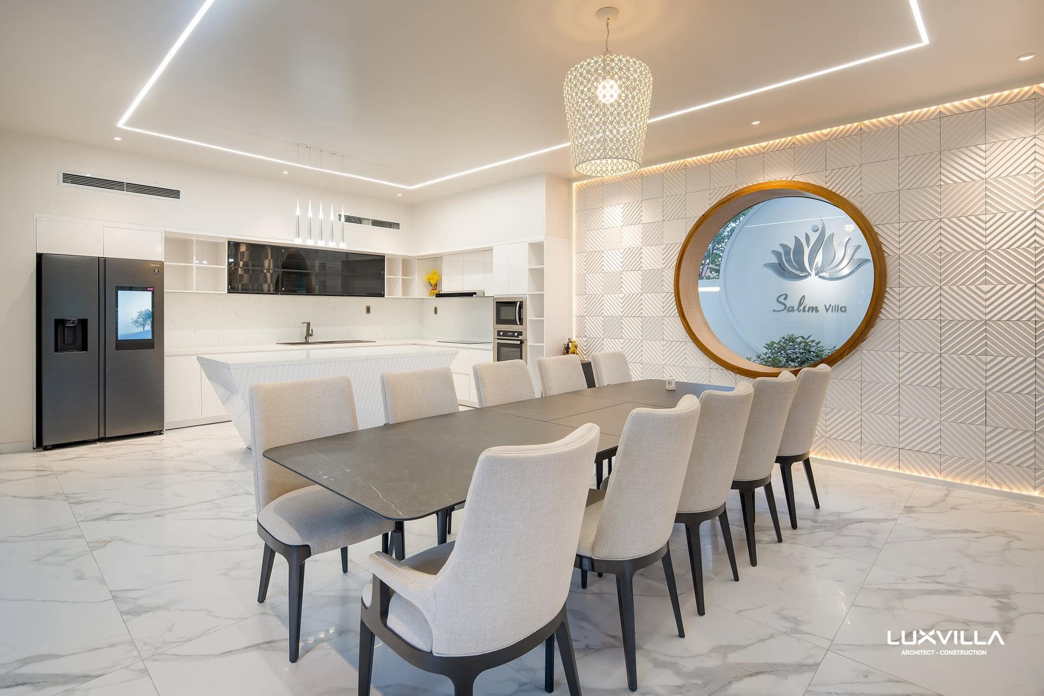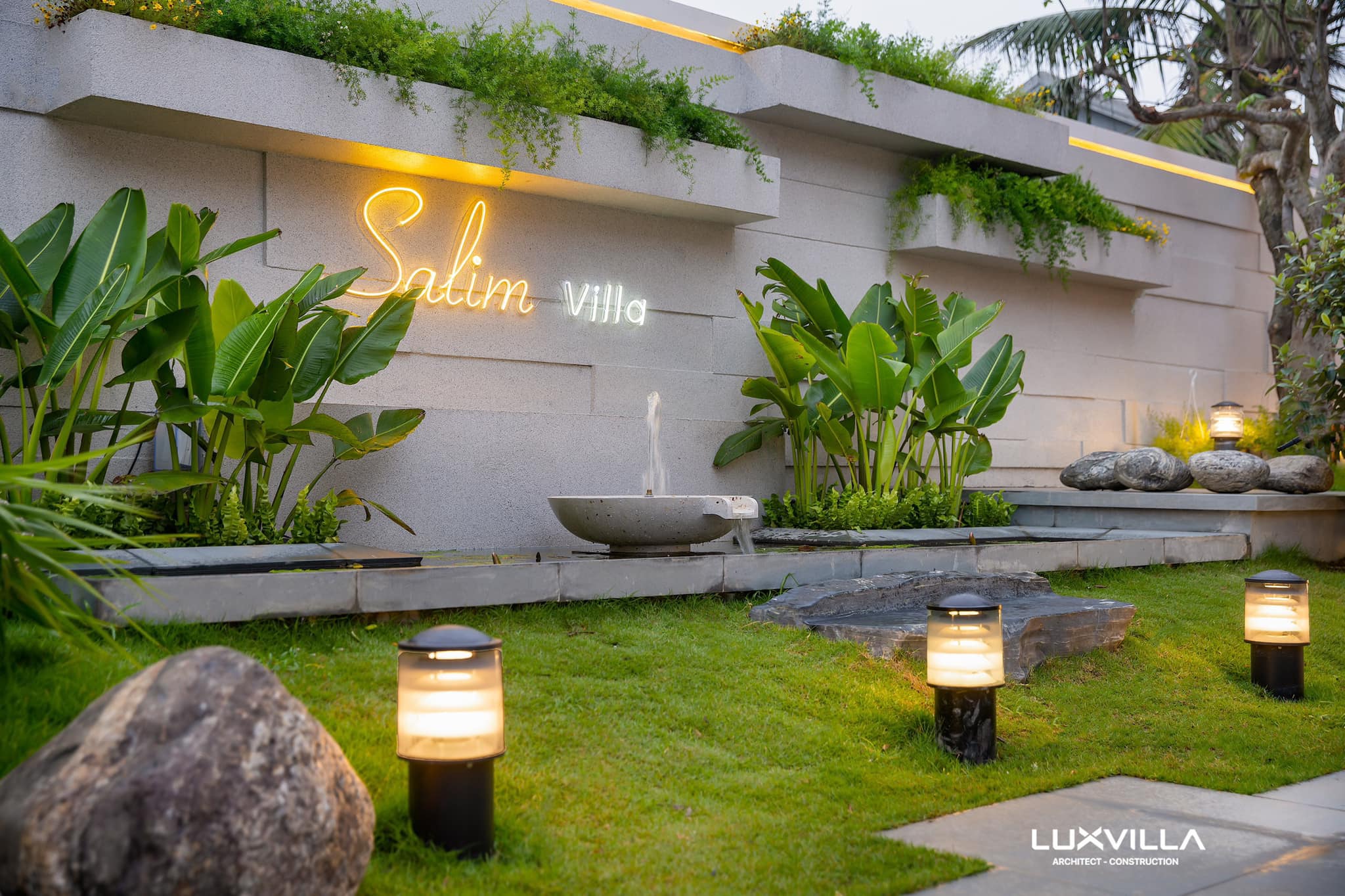 Khu vực hồ cá được gắn kết với các không gian phòng khách bếp và phòng ngủ chính tạo cho các không gian này có những nét thơ mộng, hồn nhiên vốn có của một căn biệt thự. Trung tâm của khu vực sân vườn là logo Salim Villa – tên của cô con gái bé nhỏ. Ở đây chúng tôi đã có một không gian cùng bạn bè check in tạo ra những bức hình kỷ niệm thú vị.