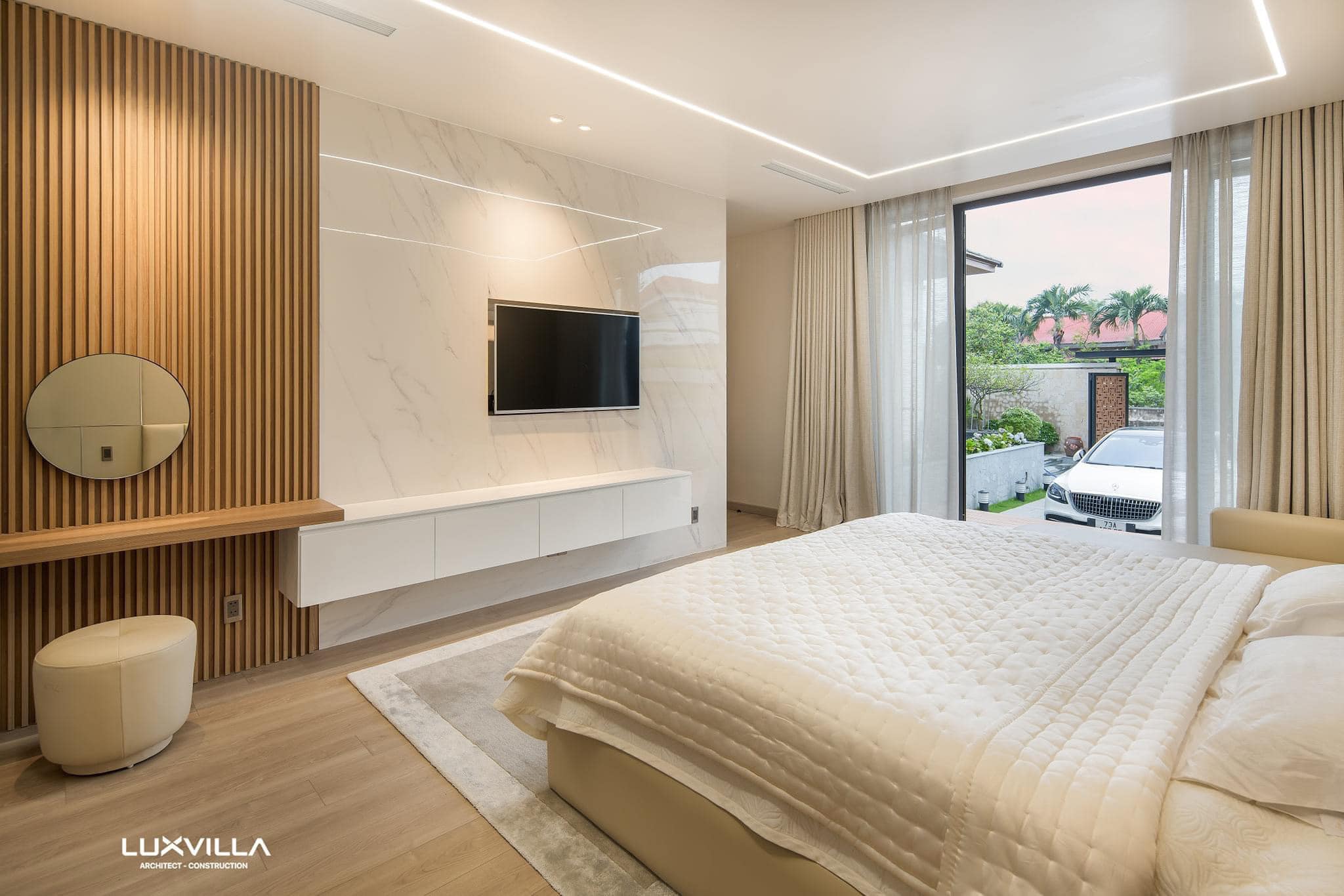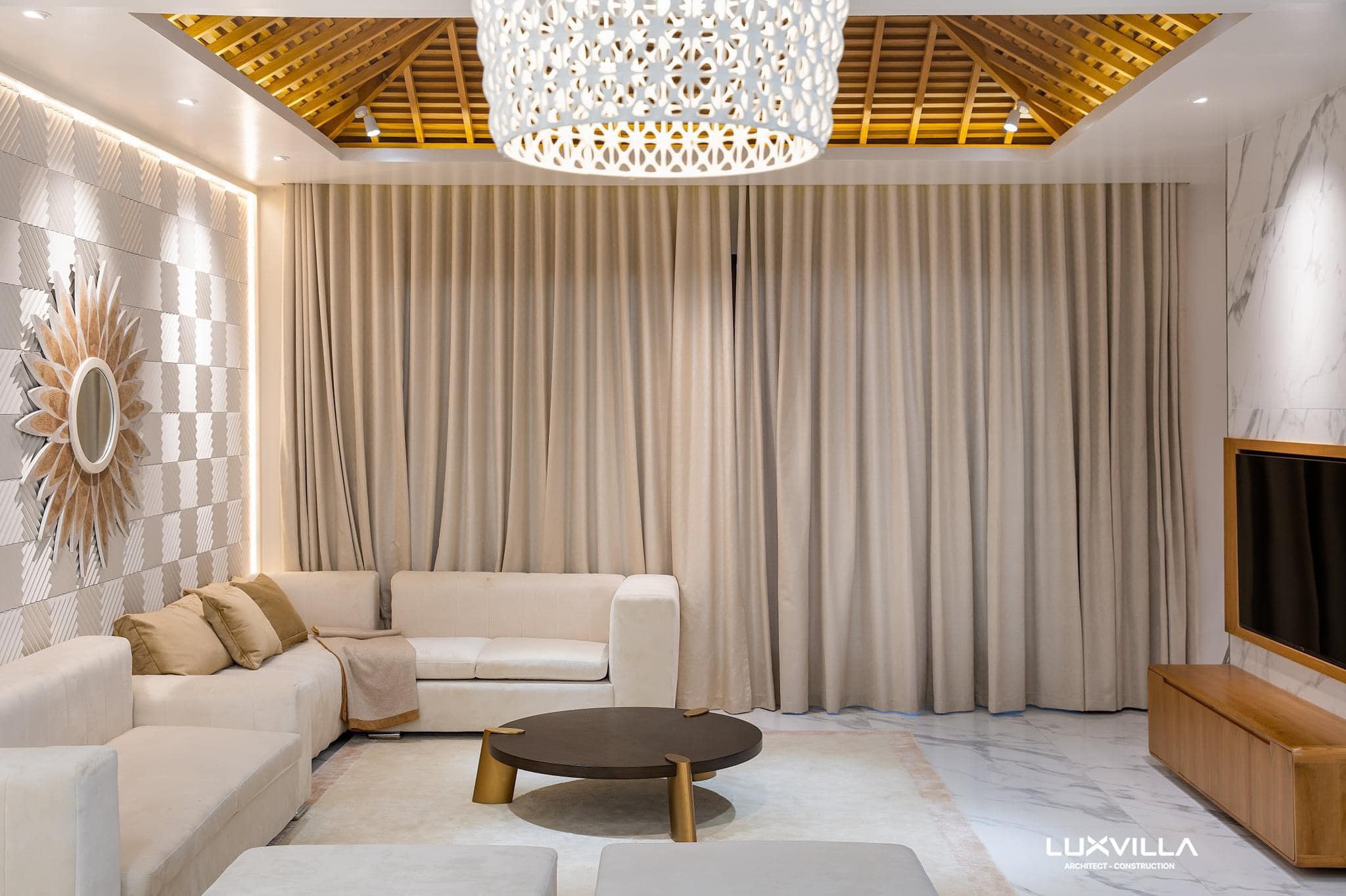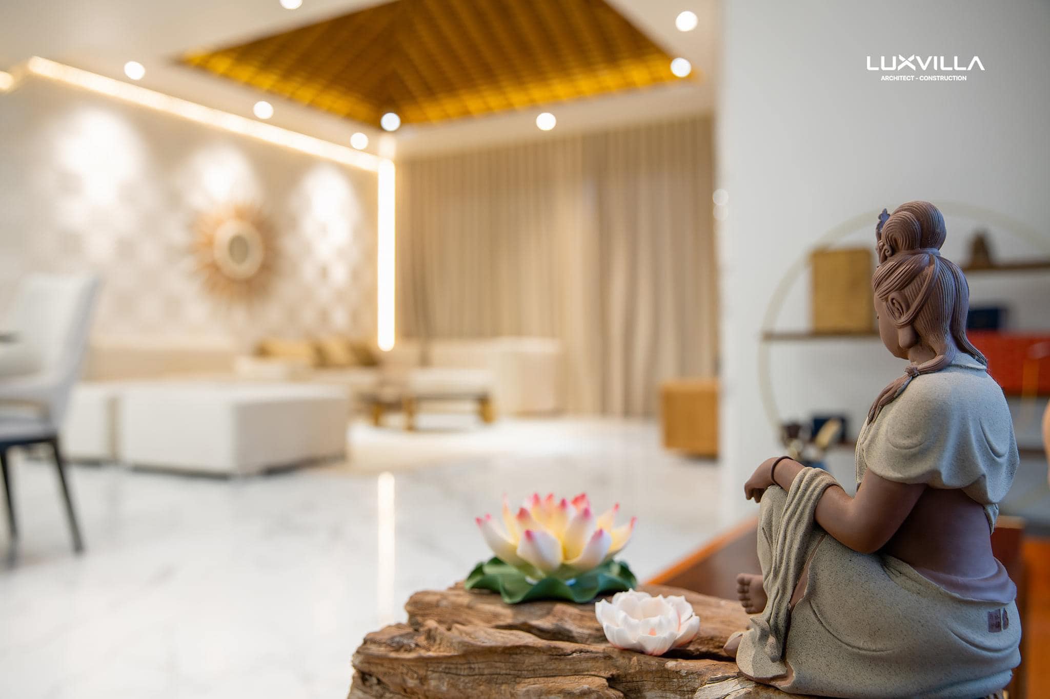 Không gian nội thất phòng khách, phòng bếp được kết nối với nhau tạo nên một không gian rộng lớn làm tăng thêm vẻ sang trọng và tiện nghi cho căn biệt thự. Những vật liệu đưa vào công trình là những vật liệu thô mộc kết hợp với hệ thống trần gỗ vút cao cho không gian này như một không gian nghỉ dưỡng thực thụ.